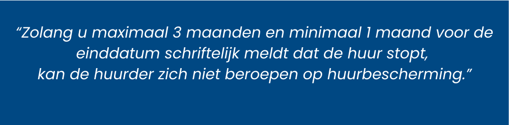 Voor tijdelijke huurcontracten geldt huurbescherming namelijk alleen tot de einddatum van het huurcontract. Laurens vervolgt: “Dat betekent dat een verhuurder de tijdelijke huur niet tussentijds mag opzeggen. Na de afgesproken termijn mag dit wel gewoon. Zolang u maximaal 3 maanden en minimaal 1 maand voor de einddatum schriftelijk meldt dat de huur stopt, kan de huurder zich niet beroepen op huurbescherming.”